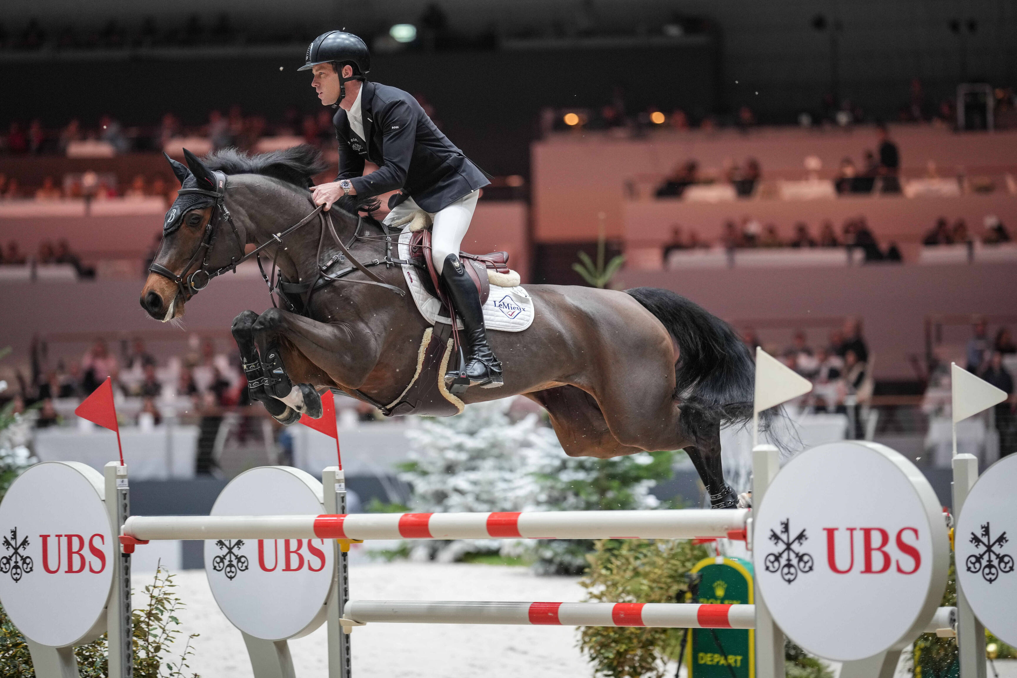 9.30pm: curtain up. Let's get started. The ten best riders in the world competed one after the other in reverse order of the world rankings. Local hero Steve Guerdat, a three-time winner of the Top 10 Final, was first to compete. After taking a three-month break for health reasons, he was making his comeback at the highest level. His performance was met with loud applause from the audience, setting the bar high. Second to start was the Frenchman Julien Épaillard with his fabulous horse, Donatello d'Auge – the reigning winner of the World Cup Final. However, this great pair knocked down a pole in the triple combination. Penalty points were also awarded to Daniel Coyle (IRL) with Incredible, Harrie Smolders (NED) with Monaco, Richard Vogel (GER) with Cloudio, and Ben Maher (GBR) with Dallas Vegas Batilly.